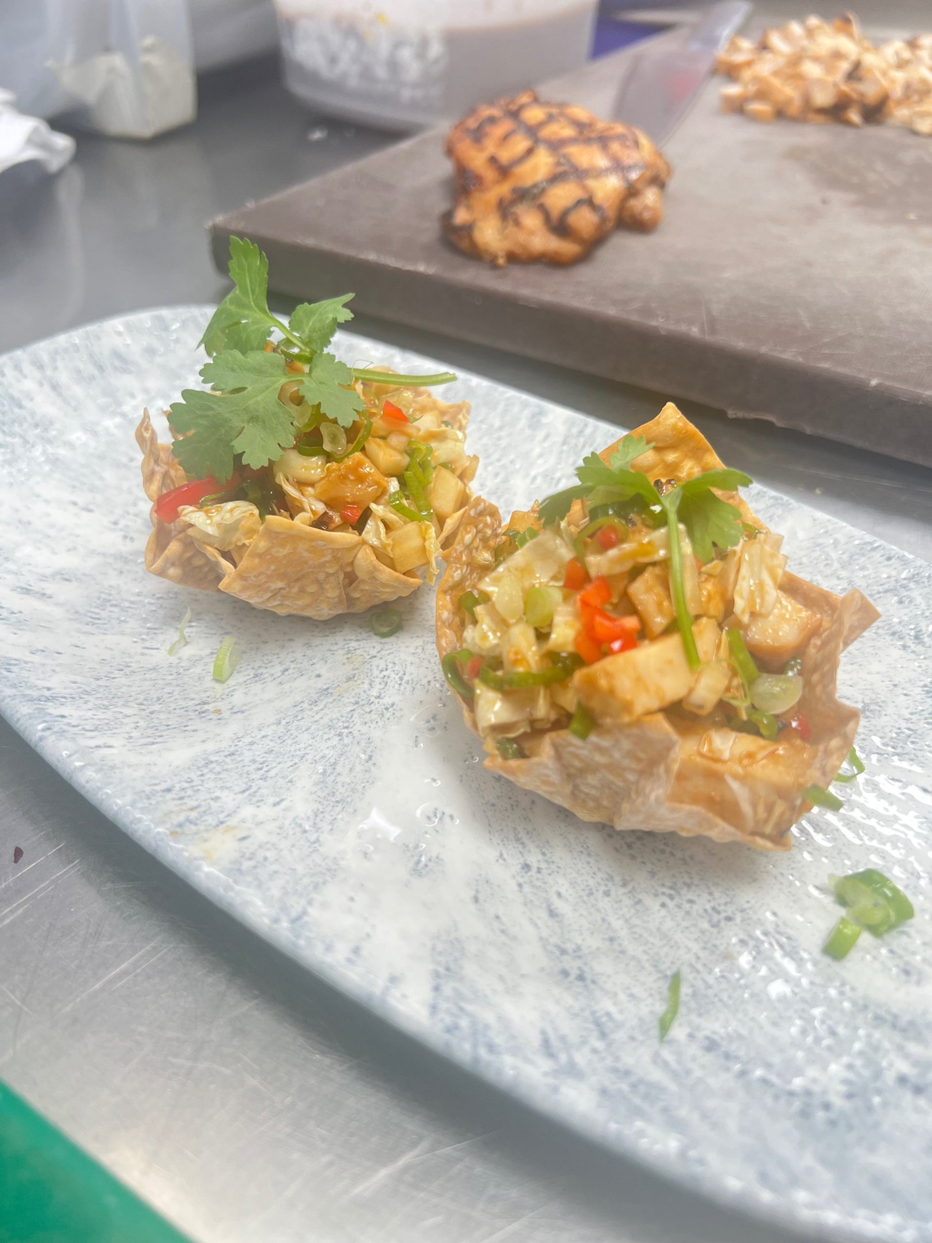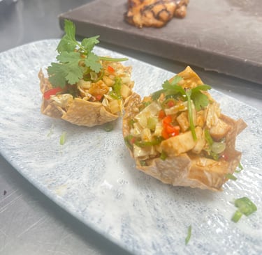 Fill the Cups: Spoon the prepared chicken mixture into each wonton cup, filling them generously without overstuffing. Serve warm as a starter for your set lunch menu.