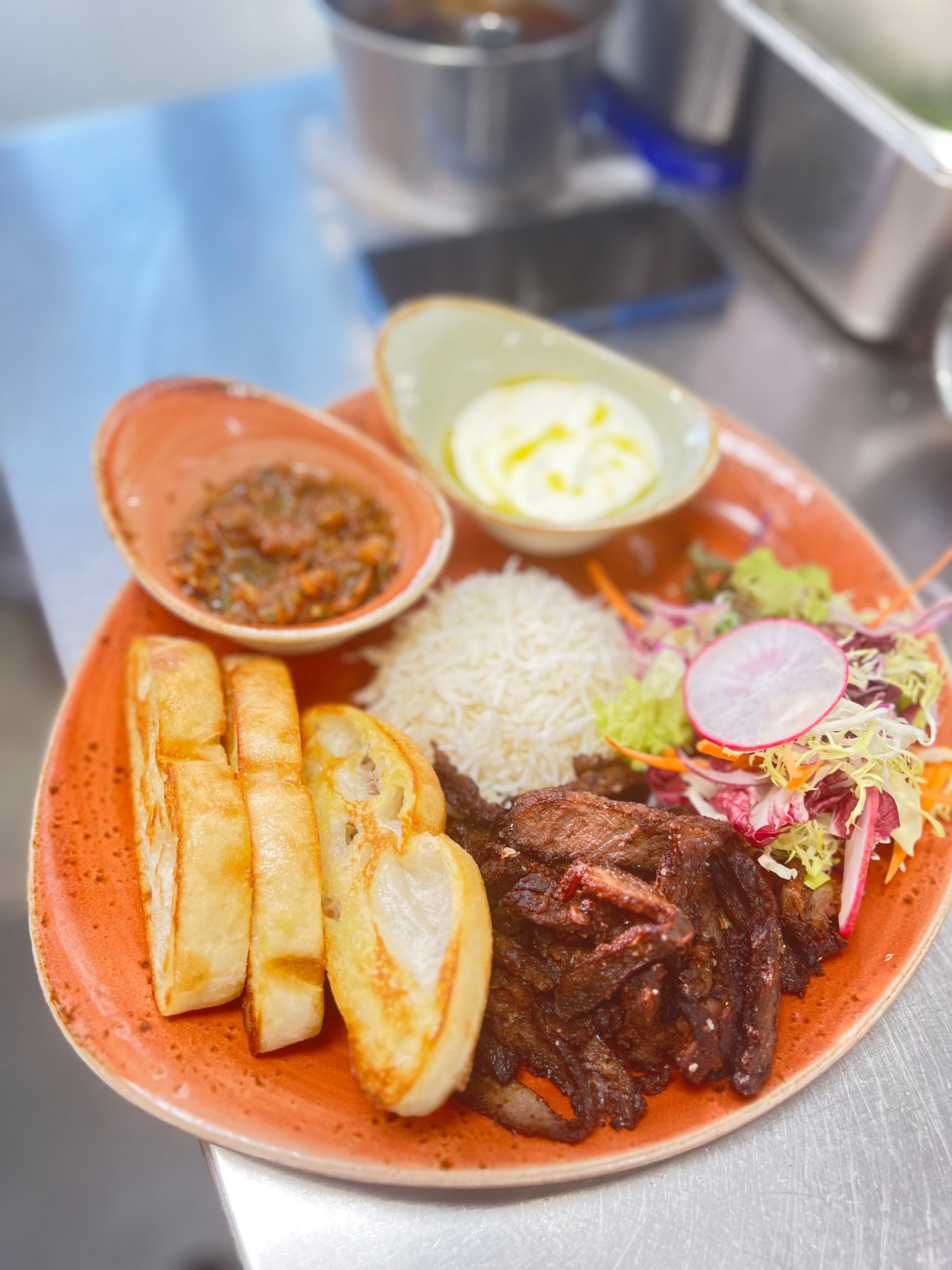 Indulge in our authentic Turkish kebab plate featuring tender shawarma lamb meat, served with a selection of traditional Turkish dip breads. Experience the rich flavors of Turkish cuisine today!